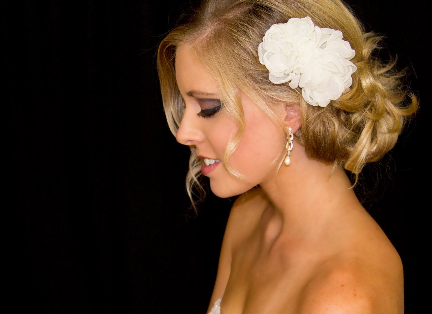 For the reception half up half down do, Ivan did a side parting with a sweeping fringe to the right, kept the volume on the crown and let the wrapped curls drop down. I really like this style, but I’m still not 100% happy with the curls. I think I want them to look a little bit less Kim Kardashian and more Kate Middleton, if you know what I mean… I love the smooth and voluminous curls look, which actually look more like defined waves. For the top half I still want to keep it nice and tidy, but maybe not so neat.